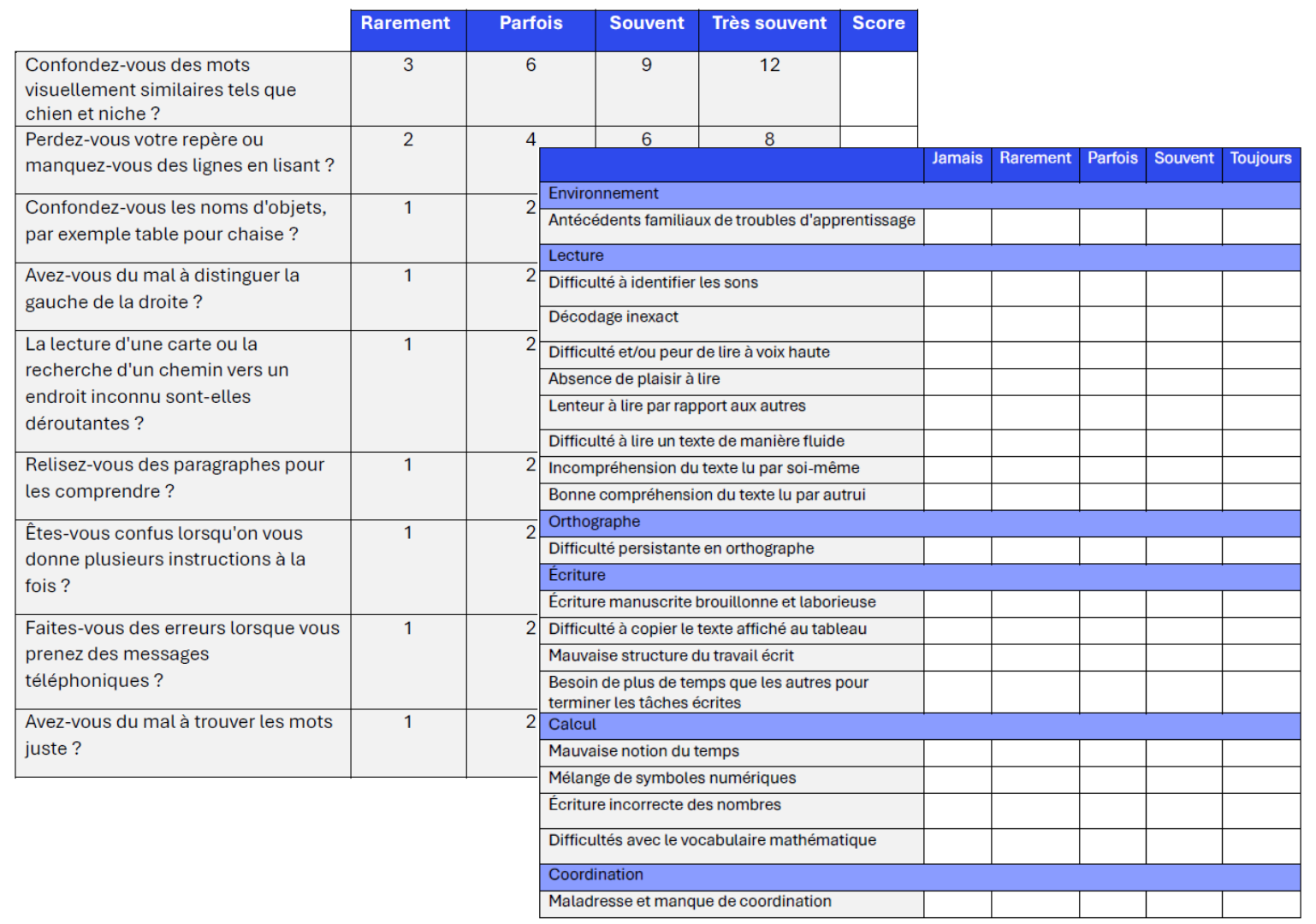 Questionnaire d'auto-évaluation de la dyslexie Adulte